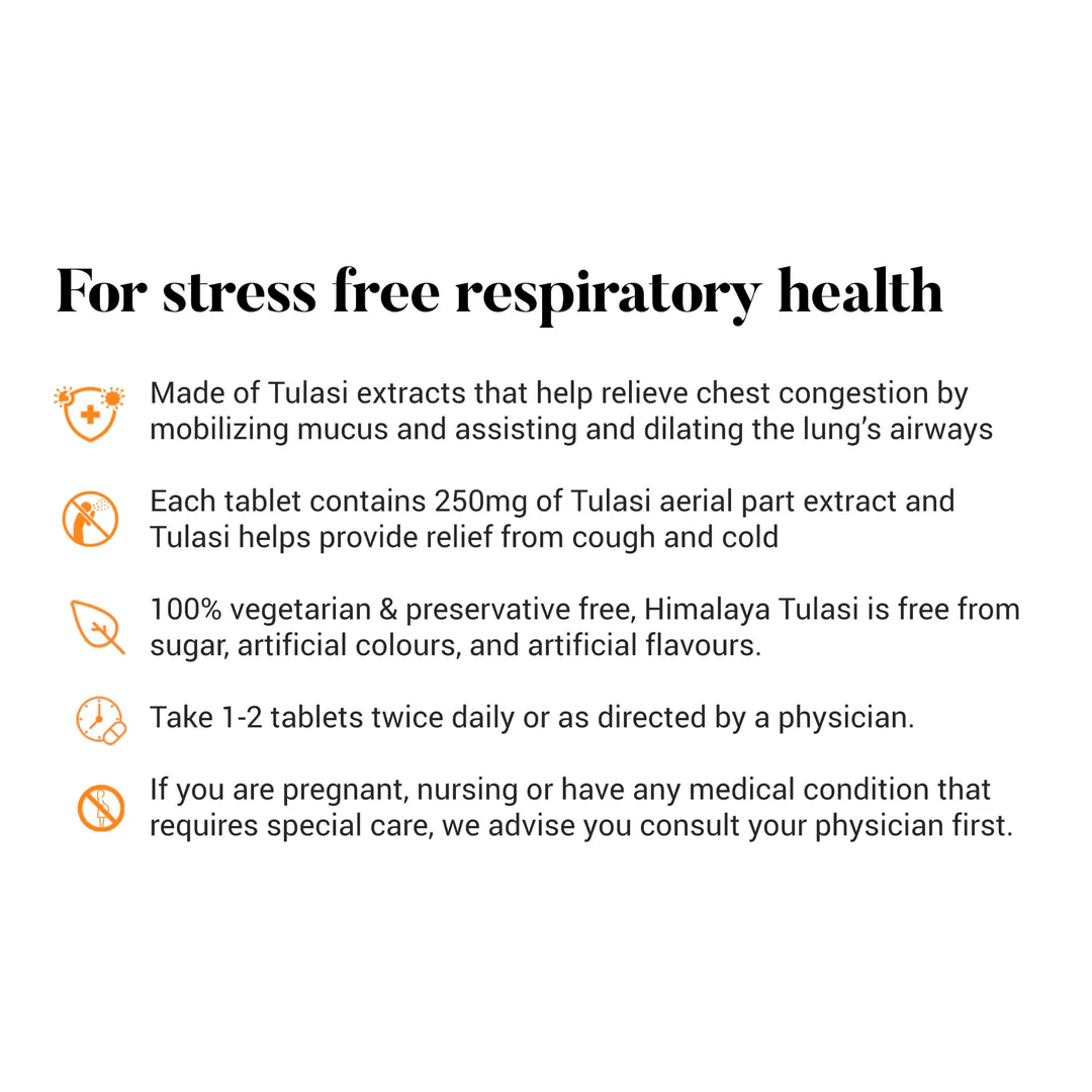 Breathe better with the healing power of Himalaya Holy Basil Tablets, a time-tested Ayurvedic remedy for respiratory health. Each tablet is enriched with Tulasi (Holy Basil)—a powerful herb known to relieve cough, ease cold symptoms, and support your immune system naturally.